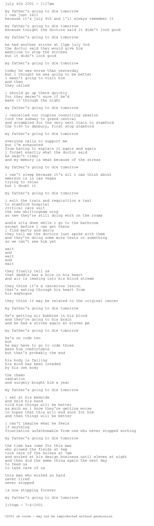 "charlie & cb" is an electronic good-bye done through the eyes of a son looking back on his father's last years of life. It's showing at the PaperVeins Museum of Art :: 2002 Biennial. Saturday September 14, - October 19, 2002. Opening Reception is September 14th, 5-7pm at HEREart 145 Sixth Avenue (Spring St & 6th Ave.)
